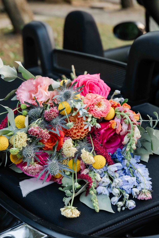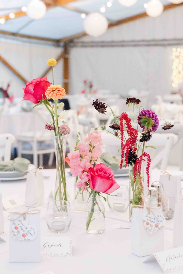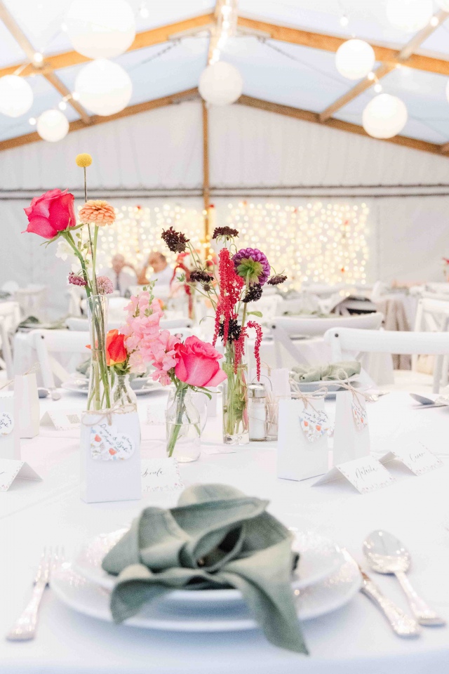 Dianaék esküvőjén is pont ilyen vibrálóan üde színeket használhattunk a dekorációban. Én kimondottan szeretem, amikor bátran lehet nyúlni a színekhez és nem csak a pasztell árnyalatok érvényesülnek a dekorációban. Nagyon szerettem ezekkel a virágokkal dolgozni. A koncepció az volt, hogy picit megidézzük a nyári mezők hangulatát a rendezvénysátorban. Diana csokra is ebben a hangulatban készült, idén azt hiszem a kedvenc csokrom volt.