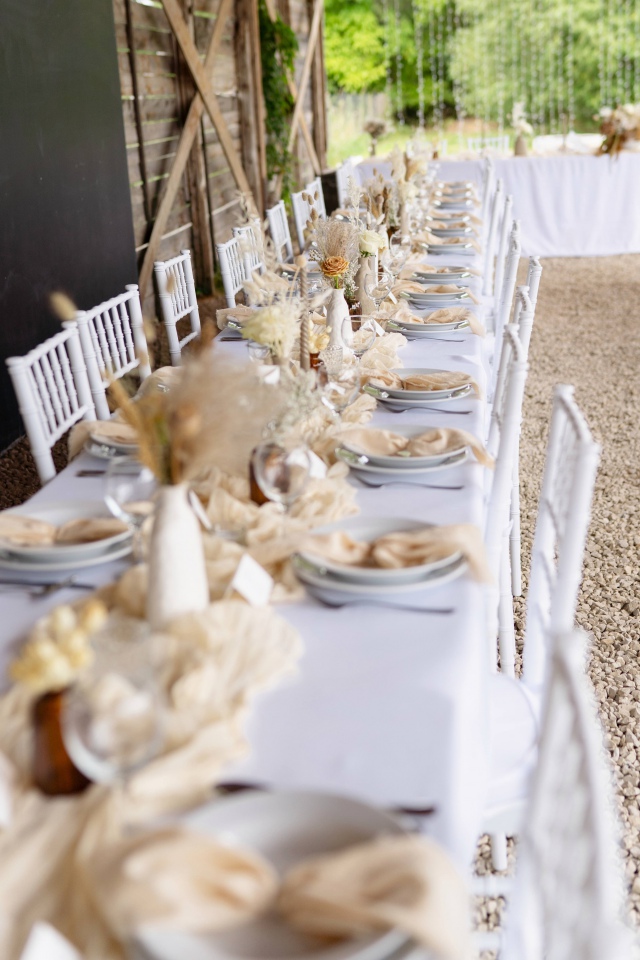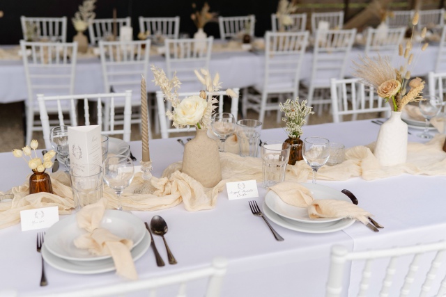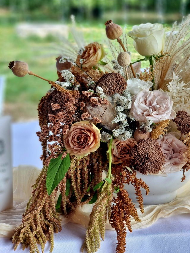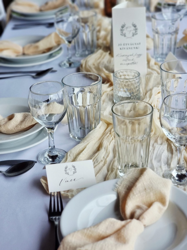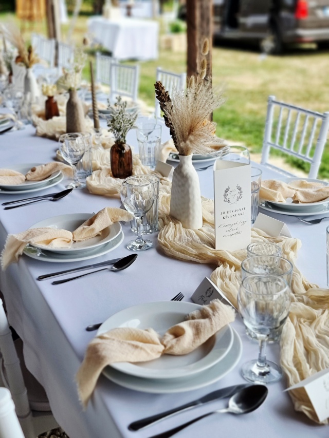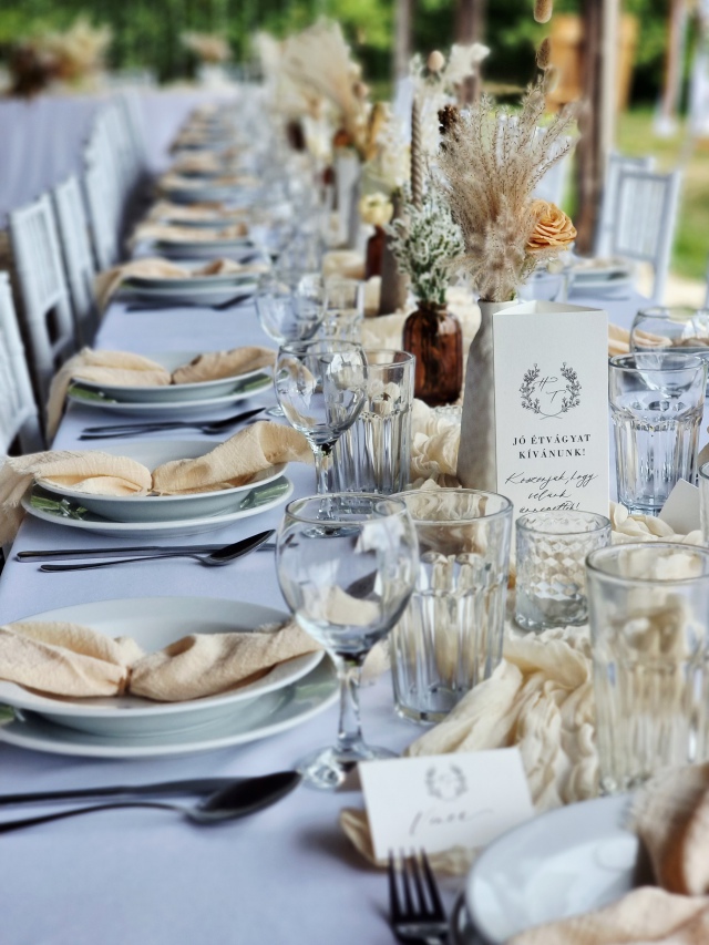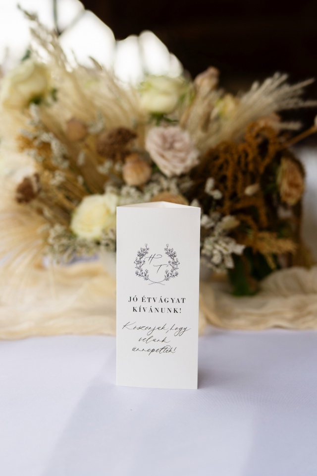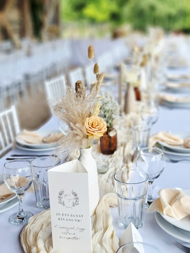 Heni kifinomult ízléssel válogatta össze az elképzeléseit a dekorációval kapcsolatban és megmondom őszintén ehhez a helyszínhez én is pont ilyen dekorációt álmodtam volna meg. A szárazvirágok nagy hangsúlyt kaptak a dekorációban, de megjelentek a virágok között a csodás földszínekben pompázó rózsák is. Az egész dekoráció nagyon légies és letisztult volt, amihez Fanni gyönyörű kalligráfiákat készített.